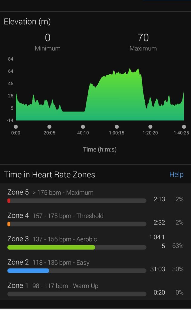 Figure 3: Elevation profile (in meters), and time spent (in minutes) in training zones
